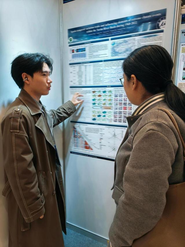 图 2025级地理学研究生杨浩鸿进行海报展示并与参会学者交流