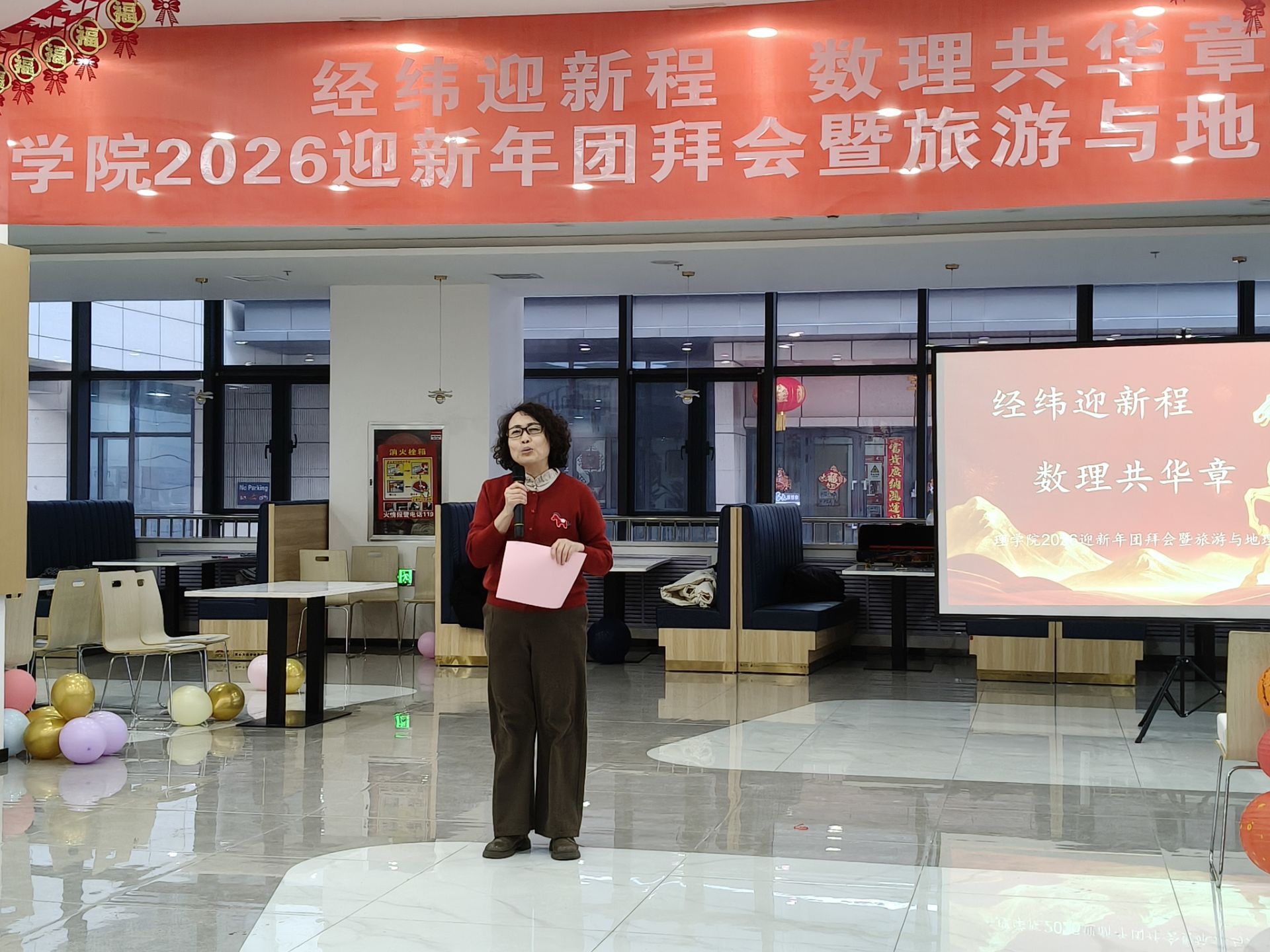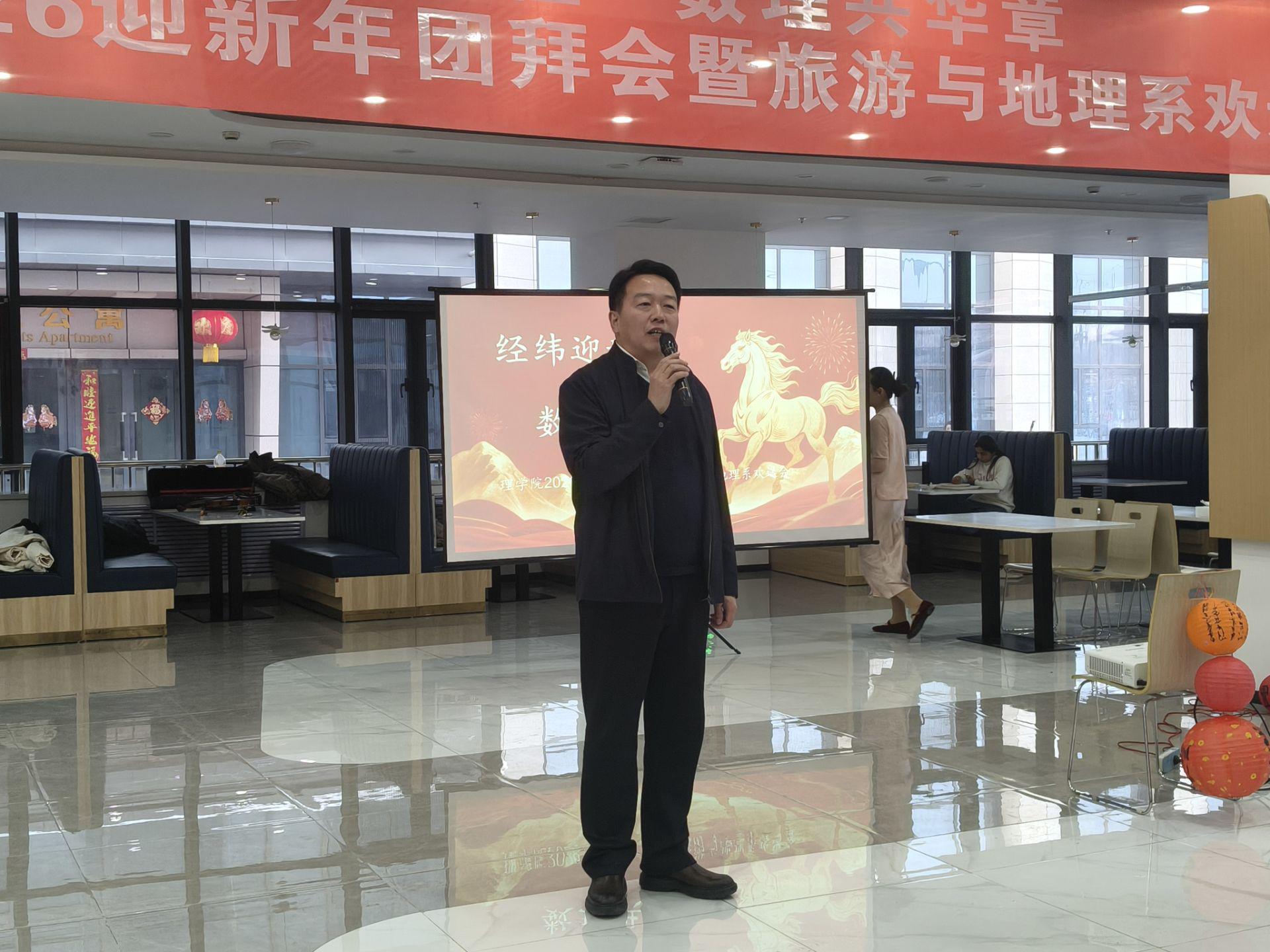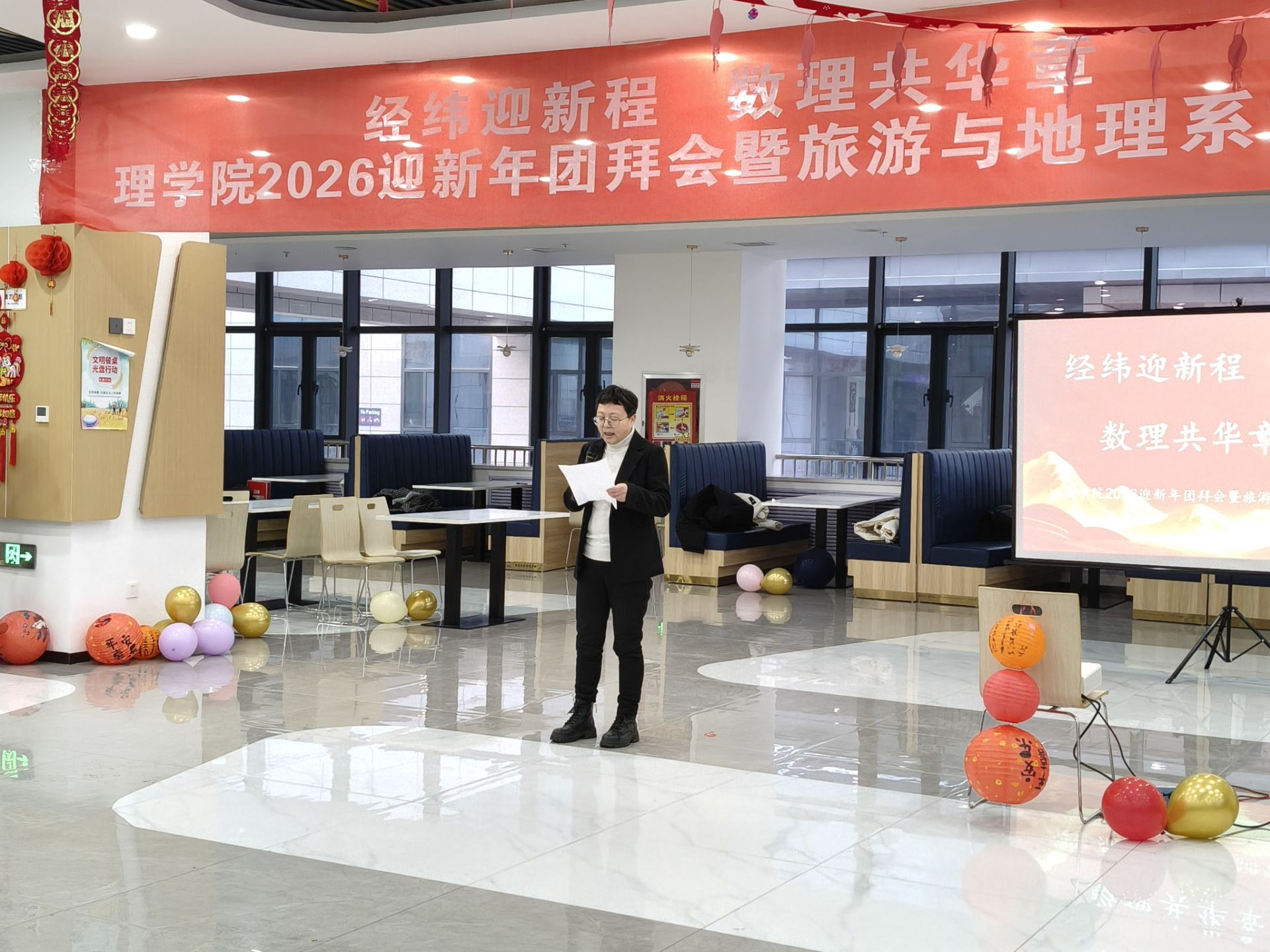 岁聿云暮,一元复始。2025年12月31日下午,“一带一路”国际教育中心一楼餐厅内暖意融融,热闹非凡。“经纬迎新程·数理共华章”——理学院2026年迎新年团拜会暨旅游与地理系欢送会在此温馨举行。学院领导、全体教师、学生代表、校友及校企合作单位代表以及城市与环境学院领导150余人齐聚一堂,同叙旧岁硕果,共启新年华章,并以最诚挚的情谊,为即将奔赴新程的旅游与地理系同仁温情送行。