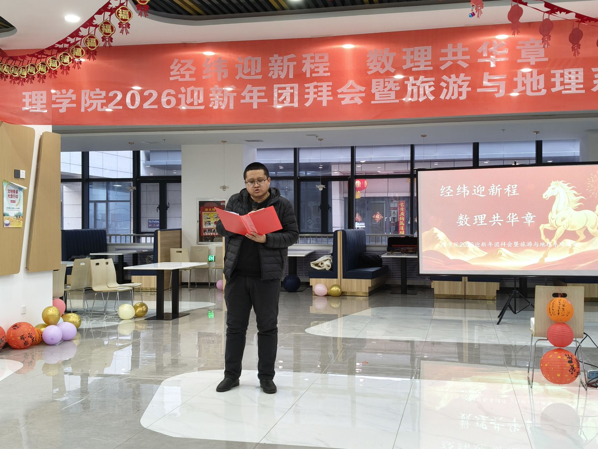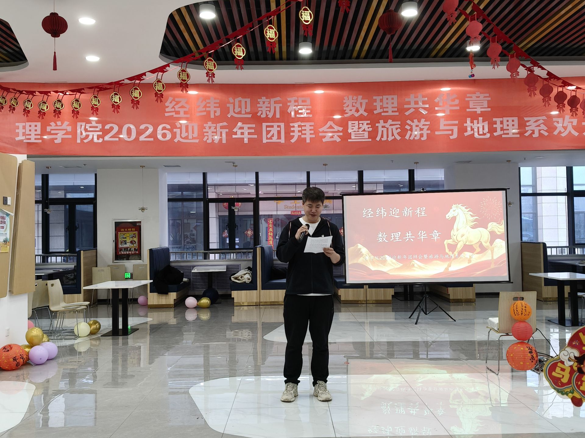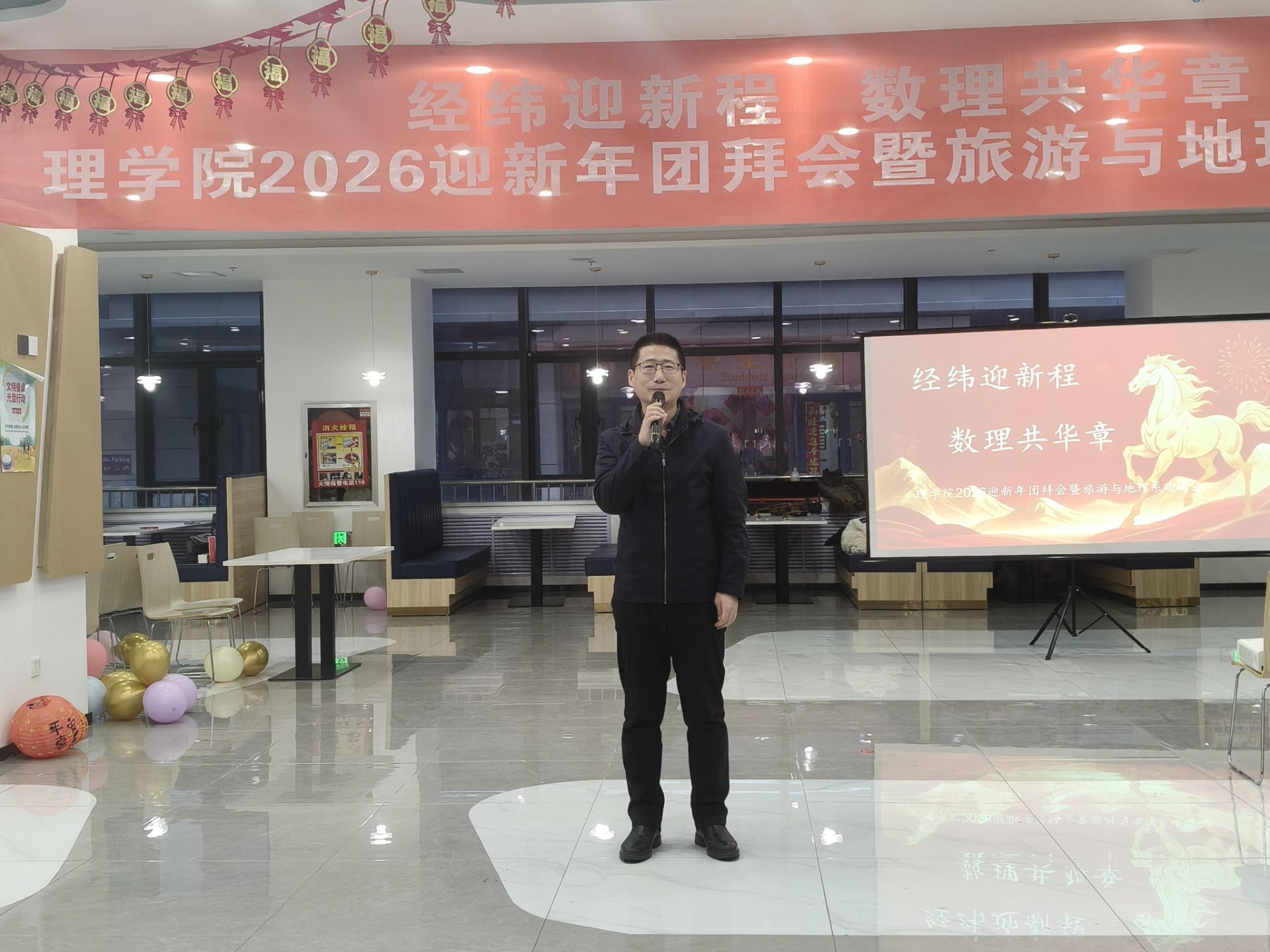 岁聿云暮,一元复始。2025年12月31日下午,“一带一路”国际教育中心一楼餐厅内暖意融融,热闹非凡。“经纬迎新程·数理共华章”——理学院2026年迎新年团拜会暨旅游与地理系欢送会在此温馨举行。学院领导、全体教师、学生代表、校友及校企合作单位代表以及城市与环境学院领导150余人齐聚一堂,同叙旧岁硕果,共启新年华章,并以最诚挚的情谊,为即将奔赴新程的旅游与地理系同仁温情送行。
