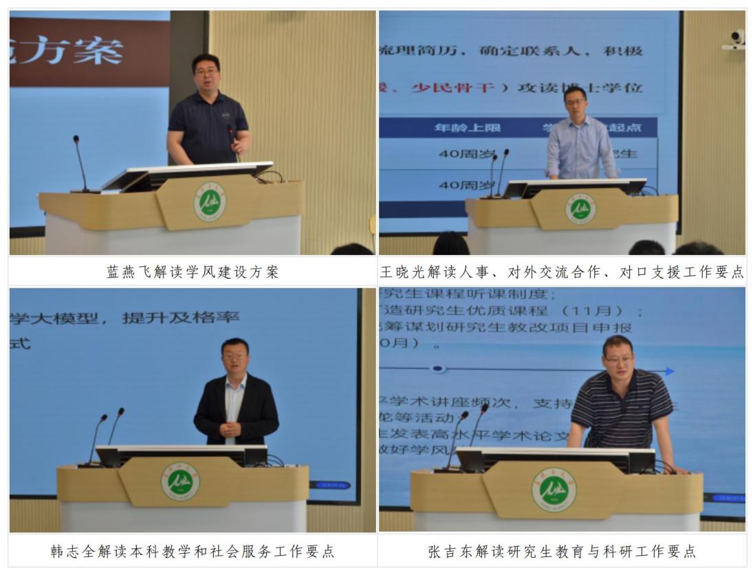 侯娟围绕科学研究、师资队伍、教育教学等方面,全面回顾了学院2025年的工作成绩。她指出,过去一年学院在自然科学基金立项、高水平论文发表、产学研合作等方面取得突破,特别是学科团队在服务兵团区域发展和边疆生态保护中发挥了积极作用;师资队伍建设上,引进和培育了多名高层次人才。结合学院“十五五”事业发展规划,侯娟对2026年重点工作作出总体部署:要聚焦“理科学科提质增效”目标,深化专业内涵建设,推动数学学科平台建设、物理学博士点申报;强化有组织科研,组建跨学科创新团队,力争在兵团相关领域产出标志性成果;同时要持续优化教师发展支持体系,激发全院教职工干事创业热情。蓝燕飞、王晓光、韩志全、张吉东分别就围绕2026年度学生工作、人事工作、本科教学工作、科研工作进行解读。